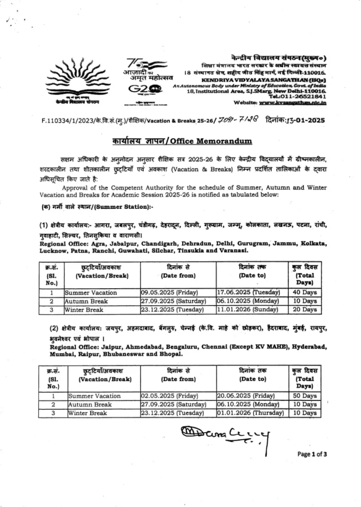 नोट: यह दिशा-निर्देश विशेष रूप से केंद्रीय विद्यालयों के लिए जारी किए गए हैं। राज्य सरकारों के अपने स्कूलों और निजी स्कूलों के अपने अलग छुट्टी के कैलेंडर हो सकते हैं। अभिभावकों और छात्रों को सलाह है कि वे अपने संबंधित स्कूलों की आधिकारिक सूचना की जाँच अवश्य करें।