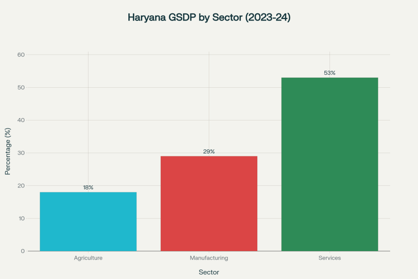 हरियाणा की अर्थव्यवस्था कृषि, उद्योग और सेवाओं के मजबूत मिश्रण द्वारा चित्रित है, जो इसे भारत की सकल घरेलू उत्पाद (जीडीपी) में एक महत्वपूर्ण योगदानकर्ता के रूप में स्थापित करती है। 2023-24 के लिए राज्य के सकल राज्य घरेलू उत्पाद (जीएसडीपी) की संरचना एक विविध आर्थिक संरचना को दर्शाती है: सेवा क्षेत्र 53% पर हावी है, विनिर्माण क्षेत्र 29% योगदान देता है, जबकि कृषि क्षेत्र 18% का हिस्सा रखता है। यह क्षेत्रीय वितरण हरियाणा के मुख्य रूप से एक कृषि प्रधान अर्थव्यवस्था से एक मिश्रित अर्थव्यवस्था में सफल संक्रमण को रेखांकित करता है, जिसमें तृतीयक गतिविधियों पर बढ़ता जोर दिया जा रहा है। 2022-23 में राज्य की प्रति व्यक्ति आय ₹1,81,961, जिसके साथ 5.4% की वृद्धि दर है, इसकी समृद्ध आर्थिक स्थिति को दर्शाती है।