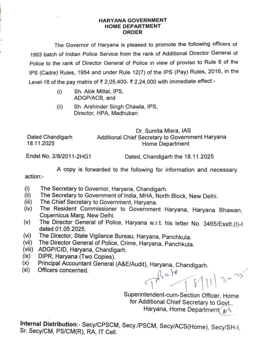 Haryana IPS: हरियाणा में दो वरिष्ठ आईपीएस अधिकारियों को बड़ी पदोन्नति मिली है। राज्य सरकार ने 1993 बैच के दो अधिकारियों – आलोक मित्तल और अर्शिंदर सिंह चावला – को अतिरिक्त पुलिस महानिदेशक (ADGP) के पद से पुलिस महानिदेशक (DGP) के पद पर तत्काल प्रभाव से पदोन्नत करने के आदेश जारी कर दिए हैं।