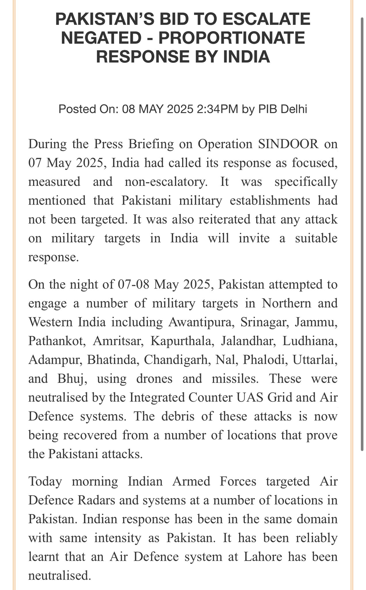 दिल्ली ब्यूरो : भारत सरकार ने आधिकारिक रूप से घोषणा की है कि पाकिस्तान द्वारा उत्तर और पश्चिम भारत में सैन्य ठिकानों को निशाना बनाते हुए किए गए ड्रोन और मिसाइल हमलों को भारतीय एयर डिफेंस सिस्टम ने सफलतापूर्वक विफल कर दिया है। साथ ही, जवाबी कार्रवाई में भारतीय बलों ने पाकिस्तान के एयर डिफेंस सिस्टम और अन्य सैन्य ठिकानों पर ड्रोन हमले किए हैं, जिनमें लाहौर भी शामिल है।