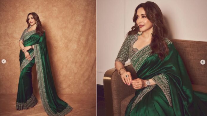 तस्वीरों में, माधुरी एक खूबसूरत हरी साड़ी पहने हुए, ग्रेसफुल और दिलकश पोज़ देती हुई नज़र आ रही हैं। उनका क्लासिक लुक, हल्के मेकअप और सहज एलिगेंस के साथ, उनके बेजोड़ आकर्षण को पूरी तरह से दिखाता है।