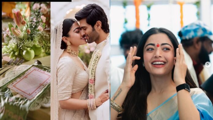 रश्मिका मंदाना ने हाल ही में वेन्यू के डेकोर की एक झलक शेयर की, और यह सीधे एक लग्जरी वेडिंग मूड बोर्ड से लिया गया है। टेबलस्केप में सॉफ्ट पिंक लिली और हल्के हरे हाइड्रेंजिया हैं, जिन्हें हरे सेब और अंगूर के गुच्छों के साथ पेयर किया गया है, जो एक फ्रेश और एलिगेंट लुक दे रहे हैं।