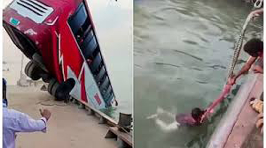 Bangladesh Bus Accident (द भारत ख़बर), ढाका : बांग्लादेश में एक दुखदायी हादसा उस समय हो गया जब यात्रियों से भरी एक बस पद्मा नदी में उस समय गिर गई जब वह एक नांव में चढ़ने की कोशिश कर रही थी। इसी दौरान नाव और बस का संतुलन बिगड़ गया और वह पद्मा नदी में गिर गई। बस में 40 लोग सवार थे जिनमें से ज्यादा संख्या उन लोगों की थी जो ईद की छुट्टियां मनाकर वापस लौट रहे थे। बांग्लादेशी पुलिस द्वारा जारी किए गए आकड़ों के अनुसार इस हादसे में अब तक 16 शव बरामद किए गए है जबकि सात लोग लापता हैं।