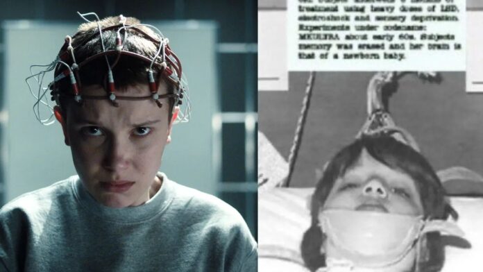 स्ट्रेंजर थिंग्स में, इलेवन की माँ, टेरी आइव्स, प्रेग्नेंट होने के दौरान अनजाने में MKUltra एक्सपेरिमेंट के लिए वॉलंटियर करती है। उसे जो साइकेडेलिक ड्रग्स और सेंसरी डेप्रिवेशन दिया जाता है, उसके कारण इलेवन टेलीकाइनेटिक और साइकिक शक्तियों के साथ पैदा होती है। हालांकि शो इन एलिमेंट्स को ड्रामैटिक बनाता है, लेकिन इंसानों पर एक्सपेरिमेंट, माइंड-कंट्रोल रिसर्च और अथॉरिटी के गलत इस्तेमाल के कॉन्सेप्ट ऐतिहासिक रूप से सही हैं। बच्चों को नामों के बजाय कोड नंबर देने का तरीका भी सीक्रेट प्रोग्राम में इस्तेमाल होने वाले असल ज़िंदगी के तरीकों जैसा है।