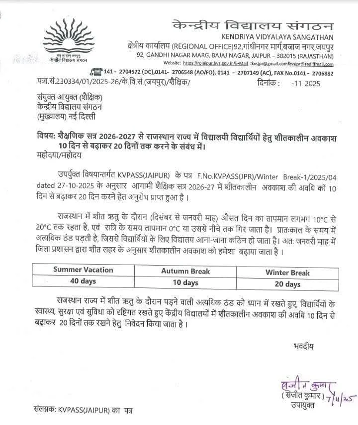 School Winter Holidays: राजस्थान के स्कूली बच्चों के लिए एक बड़ी और खुशखबरी आई है। आगामी शैक्षणिक सत्र 2026-2027 से राज्य में विद्यार्थियों के लिए शीतकालीन अवकाश की अवधि 10 दिनों से बढ़ाकर 20 दिनों तक कर दी जाएगी। यह फैसला KVPASS (जयपुर) के एक प्रस्ताव के आधार पर लिया गया है, जिसमें राज्य में पड़ने वाली कड़ाके की ठंड को ध्यान में रखते हुए छुट्टियां बढ़ाने का अनुरोध किया गया था।