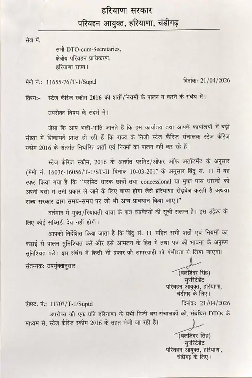 Haryana News: हरियाणा में निजी बस संचालकों की मनमानी और रियायती पास धारकों को बस में चढ़ाने से इनकार की बढ़ती शिकायतों के बीच सरकार ने कड़ा रुख अपनाया है। परिवहन विभाग ने स्पष्ट निर्देश जारी किए हैं कि राज्य के सभी निजी स्टेज कैरिज बस संचालकों को अब हरियाणा रोडवेज की तर्ज पर सभी श्रेणियों के ‘फ्री’ और ‘कन्सेशनल’ पास धारकों को यात्रा की सुविधा देनी होगी।
