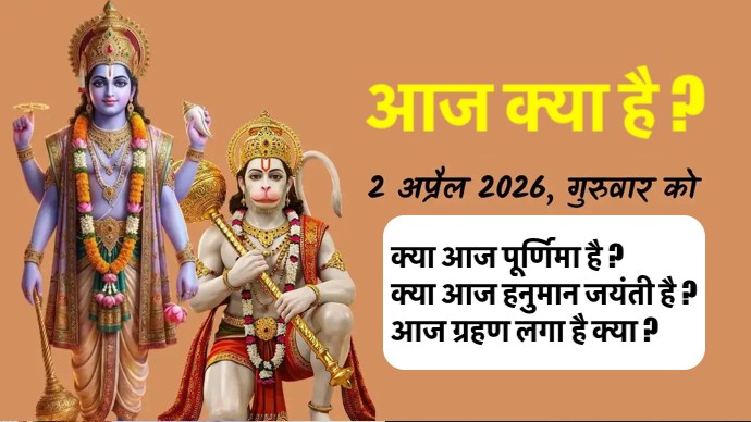 Aaj Kya hai 02 April 2026, Aaj Chaitra Purnima Hai Kya, Kya Hanuman Jayanti Aaj hi hai, kya pooja karni hai : अंग्रेजी कैलेंडर के मुताबिक आज 2 अप्रैल 2026, गुरुवार है। धार्मिक दृष्टि से यह दिन बेहद खास माना जा रहा है, क्योंकि आज चैत्र पूर्णिमा का पावन दिन है और इसी के साथ भक्तों की ओर से बड़े उत्साह से हनुमान जयंती भी मनाई जा रही है। पंचांग के अनुसार आज का दिन पूजा-पाठ, दान-पुण्य और आध्यात्मिक साधना के लिए अत्यंत शुभ माना गया है। आइए विस्तार से जानते हैं आज की तिथि, व्रत, विशेष योग और दिन का महत्व।